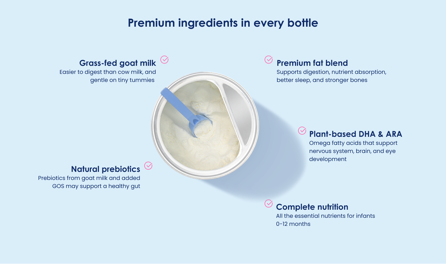 We chose goat milk as the base for our formula because it’s naturally closer in composition to breast milk than cow milk. Goat milk proteins are easier to digest than cow milk, making goat milk a more comfortable option for babies. Goat milk also naturally contains 5x more prebiotics and nucleotides than cow milk, which support the immune system, gut health, and sleep regulation.